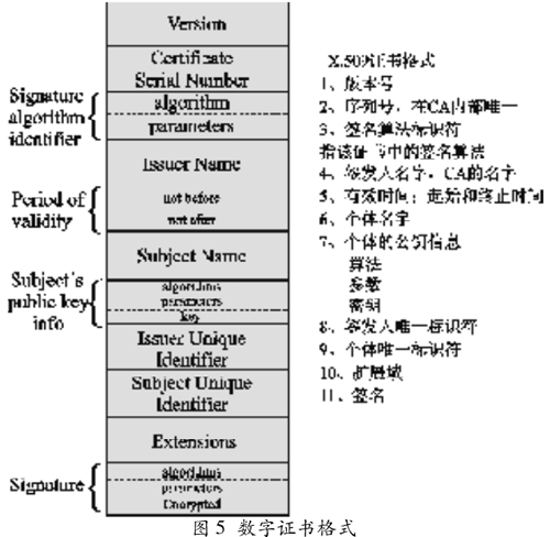 數(shù)字證書證明證書持有者身份的電子介質(zhì),由證書頒發(fā)機構(gòu)(CA)簽發(fā),至少包含一個公開密鑰、證書持有人(或單位)的名稱以及證書授權(quán)中心對這些信息的數(shù)字簽名的文件。一個證書中,最重要的信息是個體名字、個體的公鑰、機構(gòu)的簽名、算法和用途。證書的格式遵循ITUTX. 509 (v1.0、v2.0、v3.0)國際標(biāo)準(zhǔn)。數(shù)字證書的格式如圖5所示。