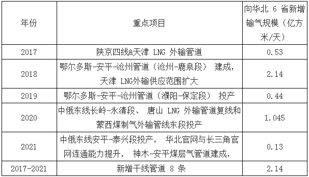 在管道運輸方面, 華北 6 省市目前 8 條供氣主干管道總數(shù)其規(guī)模達(dá)到約為 940 億立方米/年(2.7 億立方米/天), 其他 13 條管線總輸氣規(guī)模約 660 億立方米/年(1.9 億立方米/天), 在供暖季, 合計輸氣規(guī)模為 4.6 億方/天。《規(guī)劃》 為保障北方 6 省市供暖季天然氣供應(yīng), 提出到 2021 年面向 6 省天然氣管輸供應(yīng)能力較2016 年底增加 6.43 億方/天。