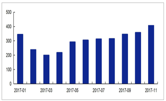 2017 年 1-11 月, 我國 LNG 進(jìn)口量 3313 萬噸, 約相當(dāng)于 447 億立方米,同比增長 48%。其中,11 月單月 LNG 進(jìn)口量為 406 萬噸,保守估計氣溫更低的 12 月份 LNG進(jìn)口量與 11 月份持平, 則我國 LNG2017 年全年進(jìn)口量預(yù)計達(dá)到 3719 萬噸, 相當(dāng)于 535 億立方米。 此前我們已經(jīng)估計 2017 年全年國內(nèi)天然氣供需缺口將近 900 億立方米, 進(jìn)口 LNG滿足其中近 60%, LNG 有望成為我國重要進(jìn)口天然氣氣源。