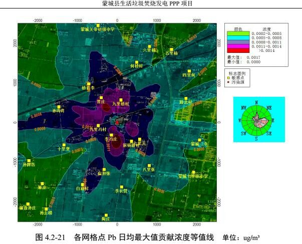 正常排放情況下,環(huán)評對PM10、TSP、SO2、NO2、HCl、Pb、二噁英、NH3、H2S的小時(shí)濃度、日均濃度、年均濃度值進(jìn)行了預(yù)測;非正常排放情況,對SO2、HCl、二噁英、NH3 和H2S的小時(shí)濃度進(jìn)行了預(yù)測。前楊新村、七里吳等26個(gè)敏感點(diǎn)未出現(xiàn)超標(biāo)結(jié)果。