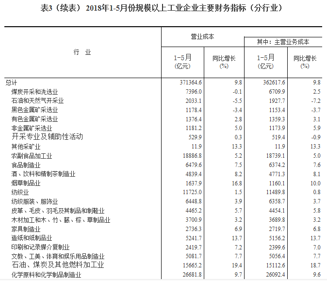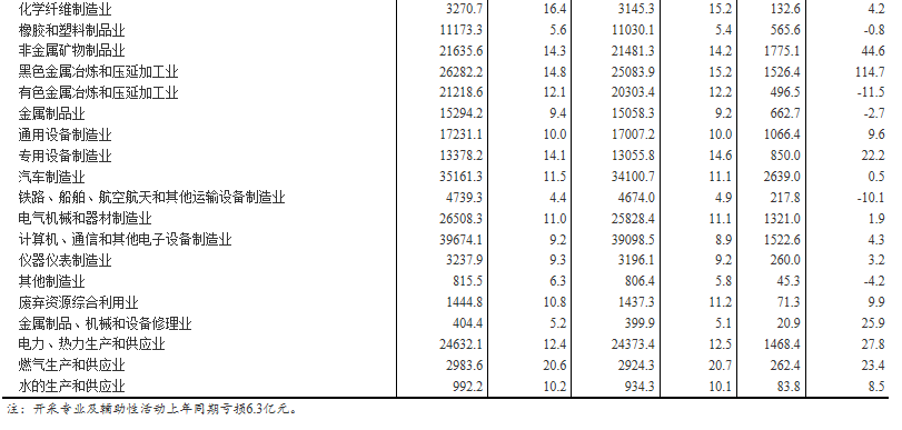 1-5月份,在41個工業(yè)大類行業(yè)中,31個行業(yè)利潤總額同比增加,10個行業(yè)減少。主要行業(yè)利潤情況如下:煤炭開采和洗選業(yè)利潤總額同比增長14.8%,石油和天然氣開采業(yè)增長2.6倍,農副食品加工業(yè)增長1.3%,石油、煤炭及其他燃料加工業(yè)增長27.9%,化學原料和化學制品制造業(yè)增長27.7%,非金屬礦物制品業(yè)增長44.6%,黑色金屬冶煉和壓延加工業(yè)增長1.1倍,通用設備制造業(yè)增長9.6%,專用設備制造業(yè)增長22.2%,汽車制造業(yè)增長0.5%,電氣機械和器材制造業(yè)增長1.9%,計算機、通信和其他電子設備制造業(yè)增長4.3%,電力、熱力生產和供應業(yè)增長27.8%,紡織業(yè)下降0.1%,有色金屬冶煉和壓延加工業(yè)下降11.5%。