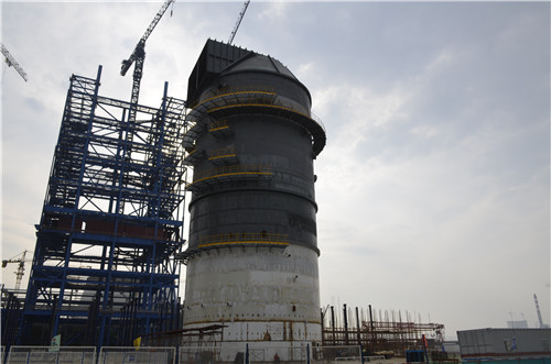 7月1日上午,錫林郭勒熱電項(xiàng)目部脫硫收塔頂升制作到頂。脫硫吸收塔是煙氣脫硫系統(tǒng)的重要裝置之一,塔罐體直徑為19m,高度為43 55m,錐體高3