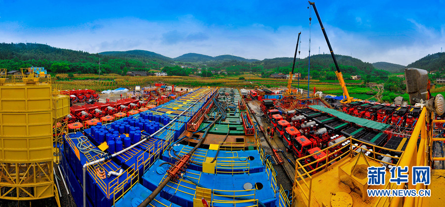 圖為焦頁(yè)42號(hào)平臺(tái)井工廠同步壓裂施工現(xiàn)場(chǎng),標(biāo)志著國(guó)內(nèi)頁(yè)巖氣開發(fā)最大規(guī)模的4口井“井工廠”同步交叉壓裂施工取得成功。新華網(wǎng)發(fā)(資料圖)