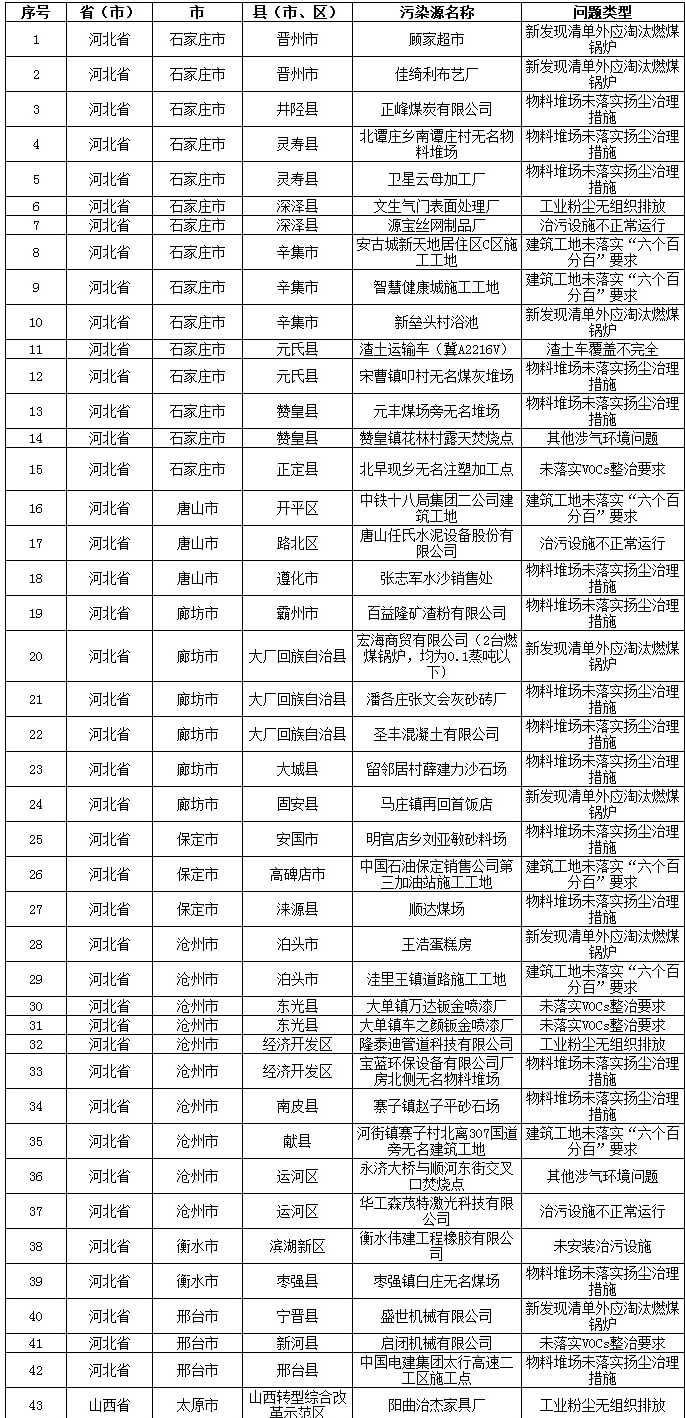 其中,河北省石家莊市靈壽縣2家、元氏縣1家、贊皇縣1家、井陘縣1家,唐山廊坊市大廠回族自治縣2家、遵化市1家,大城縣1家、霸州市1家,保定市淶源縣1家、安國(guó)市1家,滄州市經(jīng)濟(jì)開(kāi)發(fā)區(qū)1家、南皮縣1家,衡水市棗強(qiáng)縣1家,邢臺(tái)市邢臺(tái)縣1家;山西省長(zhǎng)治市壺關(guān)縣1家、長(zhǎng)子縣1家、屯留縣1家;山東省濱州市無(wú)棣縣1家;河南省鄭州新密市1家,開(kāi)封市城鄉(xiāng)一體化示范區(qū)1家,焦作市中站區(qū)1家。