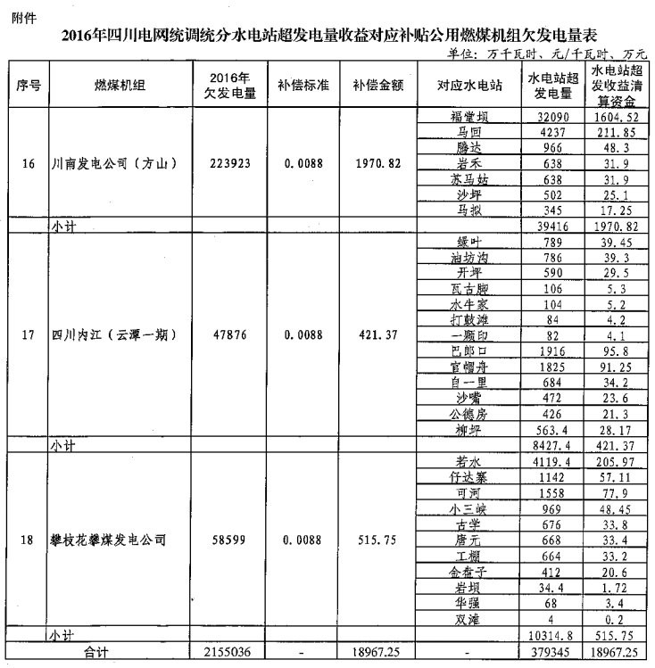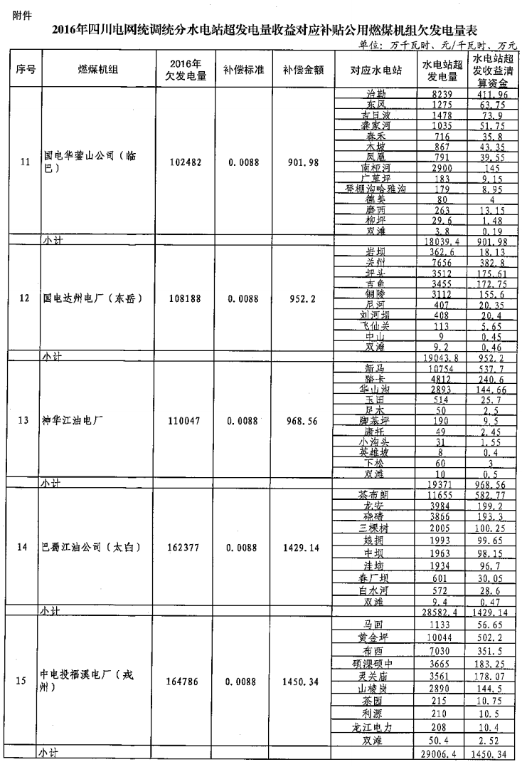 四川省 燃煤機(jī)組 電價(jià)補(bǔ)貼 水電站