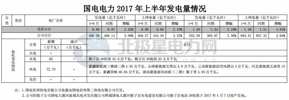 國電電力2017 年4-6 月完成發(fā)電量 486.38 億千瓦時,上網(wǎng)電量 460.37 億千瓦時,分別同比增加3.90%和3.32%;2017 年1-6 月累計完成發(fā)電量 933.39 億千瓦時,上網(wǎng)電量 883.51 億千瓦時,分別同比增加 3.36%、3.04%;平均上網(wǎng)電價 2 337.69 元/千千瓦時,較同期下降 7.44 元/千千瓦時。其中: