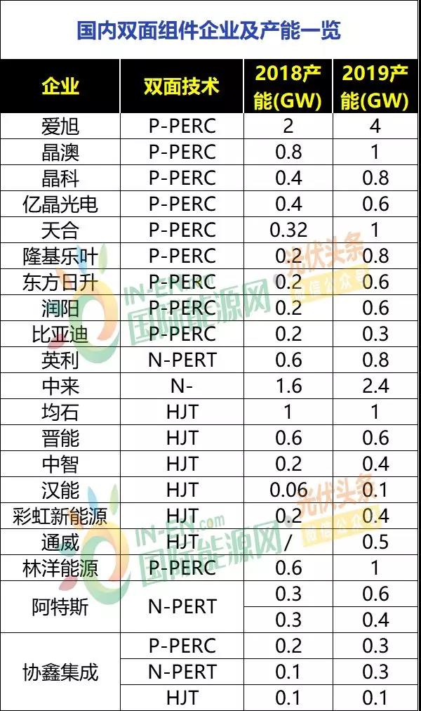 全球共有40家光伏企業(yè)生產(chǎn)雙面組件,國(guó)內(nèi)生產(chǎn)企業(yè)有晶澳、晶科、億晶、天合、隆基、東方日升等17家。2018年全球雙面組件規(guī)劃產(chǎn)能超過(guò)15GW(若以第四季廠商開(kāi)始投入生產(chǎn),實(shí)際產(chǎn)能約為3.75GW)。預(yù)估2019年雙面組件規(guī)劃產(chǎn)能可達(dá)25.74GW,為雙面組件成長(zhǎng)年。