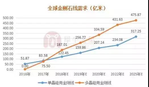 從金剛線市場(chǎng)需求來(lái)看,2018年全球硅片用金剛線需求有望達(dá)到309億米,其中單晶硅用金剛線需求約為122億米,多晶硅用金剛線需求約為187億米,2020年全球總需求為567億米。2018年末,13家金剛線廠商的規(guī)劃總產(chǎn)能將達(dá)到919億米,金剛線行業(yè)將進(jìn)入產(chǎn)能過(guò)剩階段。