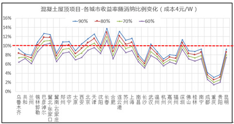 根據(jù)測算結果,對于彩鋼瓦屋面項目,初始投資成本為4.0元/W,以及消納比例在50%以下初始投資成本大于3.4元/W時,幾乎沒有城市滿足收益率要求。