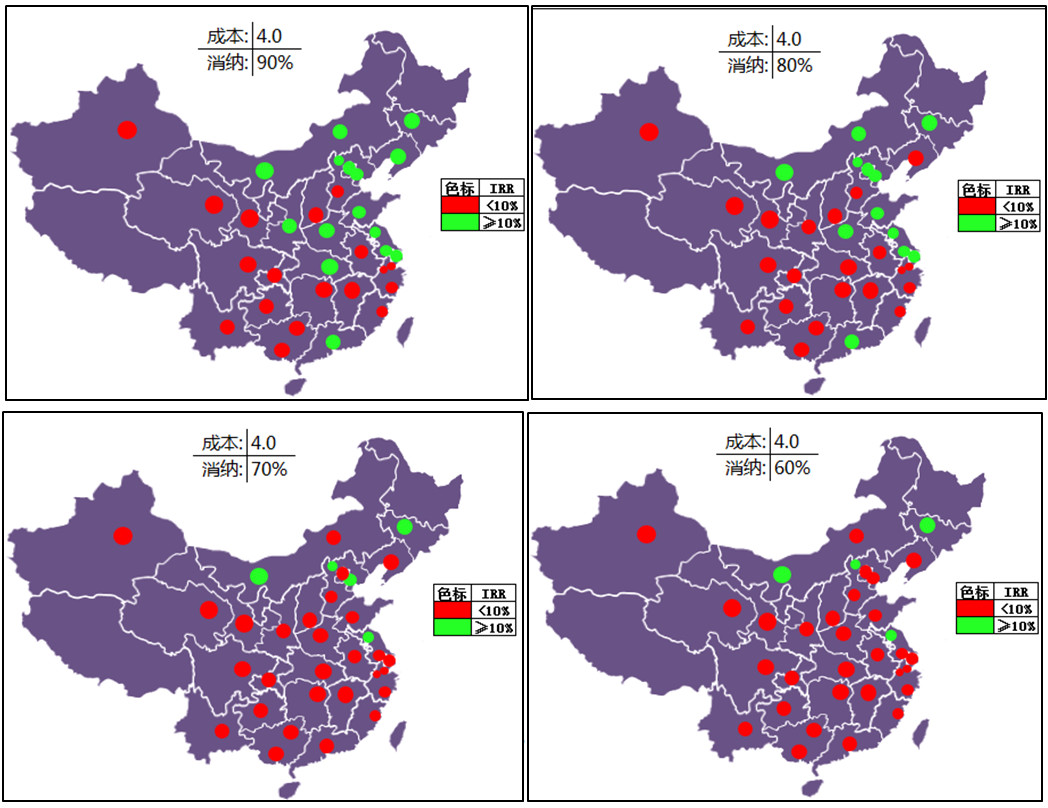 60%自用比例下有4個的城市(地區(qū))滿足收益率要求,蒙西、冀北、長春、連云港。