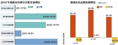 據(jù)新京報記者了解,在未能成為海潤光伏戰(zhàn)略股東的情況下,孟廣寶控制下的海潤光伏和他作為個人大股東的華君控股及相關企業(yè)(簡稱華君系)迅速走近,并發(fā)生了眾多不合規(guī)的關聯(lián)交易及資金往來,海潤光伏的業(yè)績也在孟廣寶在任的2016年大幅下滑。