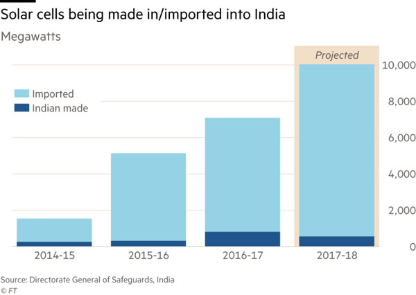 印度已成為最新的“光伏戰(zhàn)”戰(zhàn)場(chǎng),這場(chǎng)“戰(zhàn)爭(zhēng)”圍繞的是保護(hù)本土太陽(yáng)能電池板制造商免受定價(jià)低廉的中國(guó)競(jìng)爭(zhēng)對(duì)手傷害。印度監(jiān)管機(jī)構(gòu)正計(jì)劃開征一項(xiàng)稅率為70%的進(jìn)口關(guān)稅,而該國(guó)的太陽(yáng)能發(fā)電開發(fā)商警告稱,此舉可能會(huì)使該國(guó)快速發(fā)展的太陽(yáng)能發(fā)電產(chǎn)業(yè)陷入停滯。