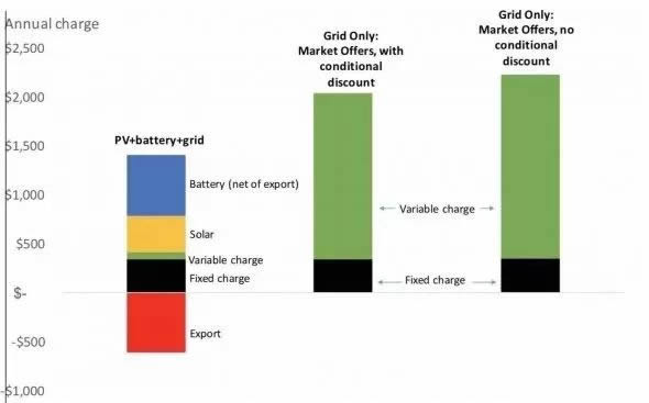 在澳大利亞,目前居民電價(jià)平均水平已經(jīng)達(dá)到0.424澳元/千瓦時(shí)(這是考慮部分折扣后的電價(jià),如果不考慮折扣平均電價(jià)達(dá)到0.464澳元/千瓦時(shí))。那么,如果澳大利亞居民無(wú)法忍受如此高昂的電網(wǎng)供電價(jià)格,自家安裝5千瓦的光伏系統(tǒng)(價(jià)格5500澳元,壽命20年),再加上特斯拉第二代電池包(Tesla Powerwall 2,容量13.5千瓦時(shí),2018年售價(jià)11,075澳元),光伏余電上網(wǎng)電價(jià)收入0.16澳元/千瓦時(shí),那么這一套系統(tǒng)每年的支出費(fèi)用明顯低于電網(wǎng)電價(jià)。