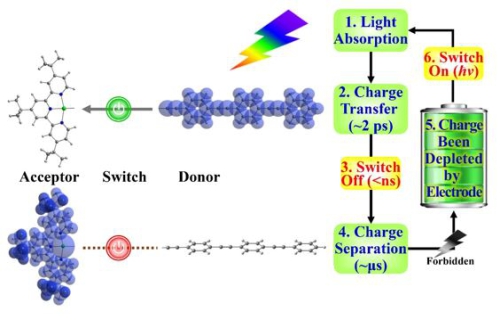 江俊課題組長期致力于光電功能分子和光催化體系設(shè)計(jì)與模擬領(lǐng)域的研究,聚焦于電子運(yùn)動(dòng)這一關(guān)鍵主線,基于第一性原理模擬進(jìn)行結(jié)構(gòu)設(shè)計(jì)以調(diào)控電子被光激發(fā)后演化行為。在此次研究中,光開關(guān)分子偶氮苯被插入到一個(gè)典型的給體-受體體系(三聯(lián)吡啶鉑配合物)中,組成一個(gè)給體-光開關(guān)-受體體系。第一性原理計(jì)算表明,該分子具有平面共軛構(gòu)型,可以吸收可見光,產(chǎn)生的受激電子會(huì)從偶氮苯和給體迅速轉(zhuǎn)移到能級更低的受體上(時(shí)間約為2皮秒);而失去電子的偶氮苯分子順反異構(gòu)勢壘會(huì)降低,從而自發(fā)發(fā)生從反式到順式的構(gòu)型轉(zhuǎn)換(時(shí)間尺度為皮秒-納秒量級);分子構(gòu)型轉(zhuǎn)變導(dǎo)致體系的共軛結(jié)構(gòu)被破壞,導(dǎo)電性也大大降低,受體上的含能受激電子無法回到偶氮苯和給體,于是電子和空穴分別被儲(chǔ)存在受體和給體上,實(shí)現(xiàn)了高效的電荷分離(激發(fā)態(tài)壽命為微秒量級);當(dāng)受激電子被消耗(流入電極)之后,分子回到基態(tài),此時(shí)的偶氮苯仍處于順式構(gòu)型,由于偶氮苯自身的特性,順式分子能夠吸收可見光轉(zhuǎn)換回到反式構(gòu)型,并開始下一輪循環(huán)。