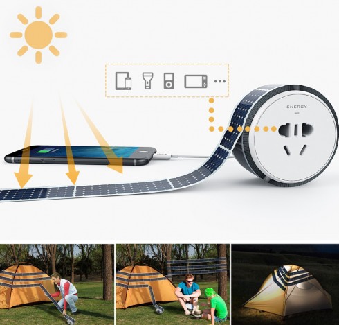 用超薄的柔性太陽能電池板,像封箱帶一樣繞成一卷,末端是一個圓形的插座,于是,需要的時候,我們可以非常方便地將電池板拉出來鋪在地上、纏在帳篷上,瞬間就能誕生一個不錯的太陽能發(fā)電站。
