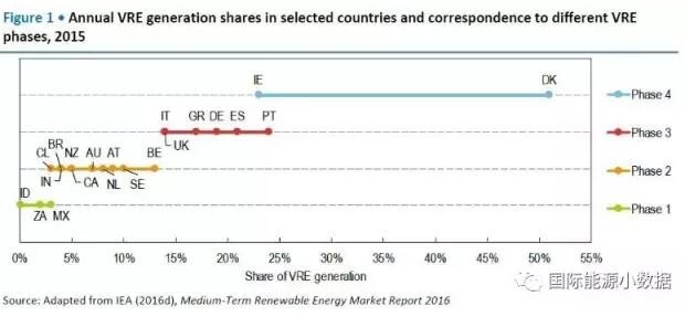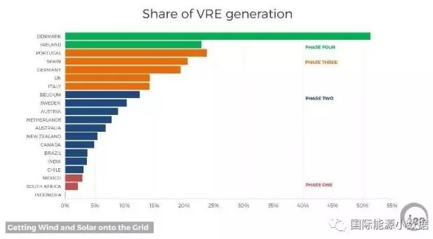 國際能源署發(fā)布報告Getting Wind and Sun onto the Grid,按照電網(wǎng)吸納間歇性可再生能源(主要是風電、光伏)的比例劃分了4個階段: