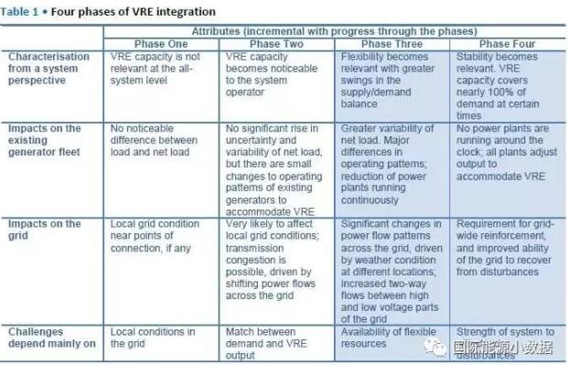 國際能源署發(fā)布報告Getting Wind and Sun onto the Grid,按照電網(wǎng)吸納間歇性可再生能源(主要是風電、光伏)的比例劃分了4個階段:...