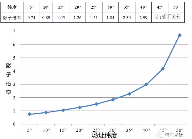 當緯度在5°~50°之間變化時,影子倍率從0.74~6.71快速增加。緯度越大,增加速率越快。