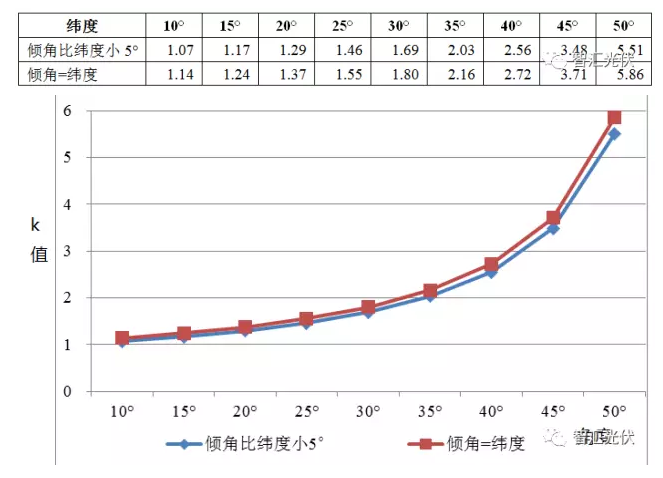 表3:不同緯度時,方陣傾角不同時的k值