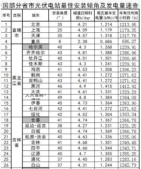 中國(guó)部分省市光伏電站最佳安裝傾角及發(fā)電量速查表(光伏從業(yè)者必備)。