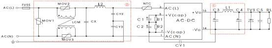 LS03-16BxxSS系列電源,如果需應(yīng)用在電磁環(huán)境比較惡劣的場(chǎng)合中,為使產(chǎn)品工作穩(wěn)定且不被電磁干擾輕易損壞,建議在電源輸入端口增加相應(yīng)的EMC外圍電路,以滿(mǎn)足一定指標(biāo)的電磁兼容性能,如圖(二)所示為推薦電路供參考: