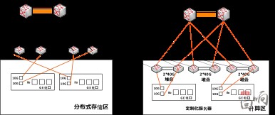 為了確保數(shù)據(jù)重構(gòu)流量不影響正常存儲(chǔ)IO訪問(wèn)流量,實(shí)現(xiàn)快速數(shù)據(jù)重構(gòu)。我們沒(méi)有采取華為推薦的網(wǎng)絡(luò)方案,而是采用環(huán)形虛擬化堆疊的方案,交換機(jī)間的堆疊鏈路采用40G光路,如圖5。將存儲(chǔ)的重構(gòu)流量都?jí)褐圃诖鎯?chǔ)環(huán)形網(wǎng)絡(luò)中。交換機(jī)到服務(wù)器采用2*10G連接,可以根據(jù)情況采用主備或分擔(dān)的模式。