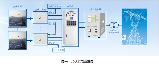 在太陽能光伏發(fā)電系統(tǒng)中,為了減少光伏電池陣列與逆變器之間的連線,以組串形式構(gòu)建光伏陣列,再將相應(yīng)數(shù)量光伏陣列并聯(lián)接入光伏匯流箱進(jìn)行電能匯流,經(jīng)直流柜輸出給光伏逆變器,逆變升壓后并入電網(wǎng),因此完整的光伏發(fā)電系統(tǒng)包括光伏陣列組、光伏匯流箱、直流柜、光伏逆變器、升壓變壓器等部分。如圖一所示: