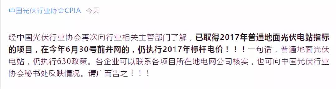 經(jīng)中國光伏行業(yè)協(xié)會再次向行業(yè)相關(guān)主管部門了解,已取得2017年普通地面光伏電站指標(biāo)的項(xiàng)目,在今年6月30號前并網(wǎng)的,仍執(zhí)行2017年標(biāo)桿電價(jià)!?。∫痪湓?,普通地面光伏電站,仍執(zhí)行630政策。