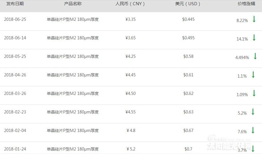 通過以上可以發(fā)現(xiàn),無論是單晶還是多晶,在今年都進行了大幅調(diào)價。其中單晶硅片價格從1月份的5.2元/片降到了現(xiàn)在的3.35元/片,降價1.85元,降幅36%;多晶硅片價格從年初的4.7元/片降到現(xiàn)在的2.3元/片,降價2.4元,降幅51%!半年之內(nèi)經(jīng)歷如此大幅度的降價,極為罕見。