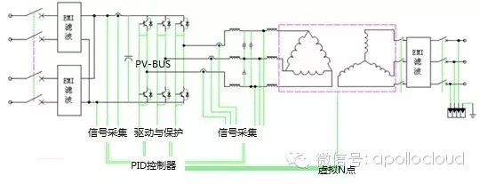 工作原理:此工作原理是利用逆變器交流輸出虛擬N線電壓采集時(shí)以PV-BUS母線中點(diǎn)作為參考點(diǎn);此方案是通過采集器實(shí)時(shí)采集PV-BUS母線電壓, PID控制模塊抬升逆變器N點(diǎn)對(duì)地電壓300-500V,將N點(diǎn)電壓抬升至半母線電壓,從而將逆變器PV-BUS母線中點(diǎn)對(duì)地電壓抬升300-500V。