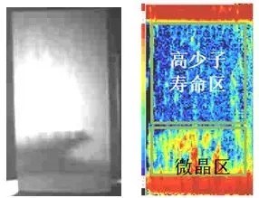 在實(shí)驗(yàn)中首次發(fā)現(xiàn)細(xì)小均勻的晶粒具有抑制位錯(cuò)增殖,減少位錯(cuò)密度的作用。圖1為鑄造多晶硅塊少子壽命圖與硅塊IR圖。該圖表明細(xì)小的晶粒具有抑制位錯(cuò)增殖,減少位錯(cuò)的功能。
