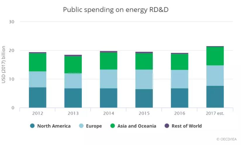 政府低碳能源研發(fā)和開發(fā)支出估計在2017年增加了13%。經過多年的減少和停滯,這是一個令人欣喜的增長。低碳能源技術研發(fā)和開發(fā)支出的大部分增長都是由北美推動的,超過了歐洲和日本的下降幅度。
