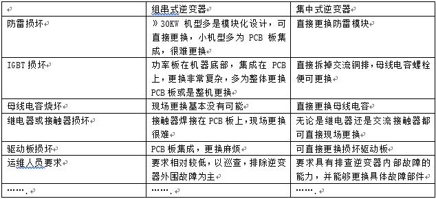 另外,從逆變器維護(hù)角度來(lái)看,組串式逆變器與集中式逆變器相比,在維修上存在較大差距:組串式逆變器的維修以整機(jī)更換為主,對(duì)運(yùn)維人員的技術(shù)要求相對(duì)較低;集中式逆變器則已局部維修為主,常采用模塊化的更換方式,對(duì)運(yùn)維人員的技術(shù)要求相對(duì)較高: