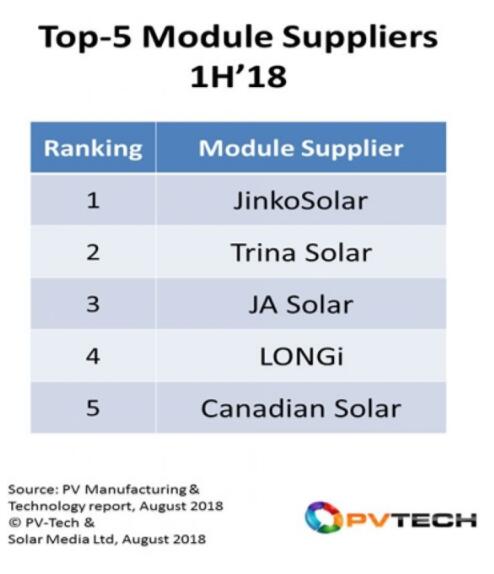 全球光伏行業(yè)前五大光伏組件供應(yīng)商在2018年上半年出貨量超過20吉瓦,同比增長(zhǎng)10%。
