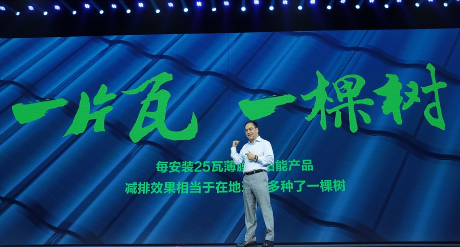 全國工商聯(lián)副主席、漢能控股集團董事局主席李河君在題為《一片瓦·一棵樹》的演講中表示:“漢能一直圍繞住、行兩大領域,進行重點產品布局,讓建筑的屋頂、墻面都裝上薄膜太陽能,一直是我們的目標。今天發(fā)布的漢瓦無疑是一次全新的突破,一次顛覆。每安裝25瓦薄膜太陽能產品,所達成的減排效果,就相當于在地球上多種了一棵樹。漢能一片曲面瓦的功率是30瓦,安裝一片漢瓦,就多種了一棵樹。瓦片雖小,但它的環(huán)保價值非常大,所有的參與者都是在造福社會。”
