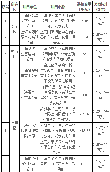 根據(jù)《上海市可再生能源和新能源發(fā)展專項(xiàng)資金扶持辦法》(滬發(fā)改能源〔2016〕136號(hào)),市發(fā)展改革委會(huì)同相關(guān)部門(mén)和單位,組織開(kāi)展了2017年第一批可再生能源和新能源發(fā)展專項(xiàng)資金扶持項(xiàng)目的申報(bào)和評(píng)審工作。在專家評(píng)審意見(jiàn)的基礎(chǔ)上,經(jīng)審核,上海服裝集團(tuán)實(shí)業(yè)有限公司73.06千瓦屋頂分布式光伏發(fā)電項(xiàng)目等61個(gè)光伏項(xiàng)目(共27448.735千瓦)和1313戶個(gè)人光伏(共8179.206千瓦)符合條件,列入市可再生能源和新能源發(fā)展專項(xiàng)資金獎(jiǎng)勵(lì)目錄予以支持(詳見(jiàn)附件)。