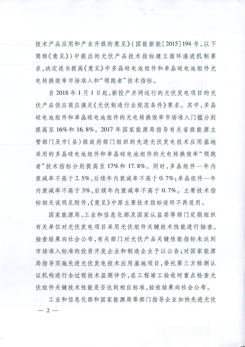 據(jù)能源局網(wǎng)站8日消息,能源局日前發(fā)布關于提高主要光伏產(chǎn)品技術指標并加強監(jiān)管工作的通知。通知提出,自2018年1月1日起,新投產(chǎn)并網(wǎng)運行的光伏發(fā)電項目的光伏產(chǎn)品供應商應滿足《光伏制造行業(yè)規(guī)范條件》要求。業(yè)內(nèi)