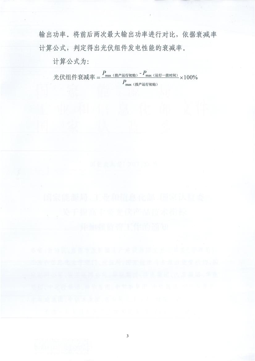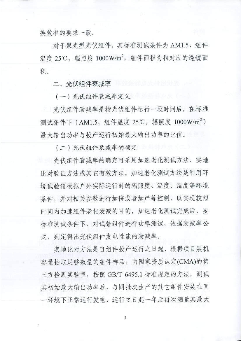 同時,多晶組件一年內(nèi)衰減率不高于2.5%,后續(xù)年內(nèi)衰減率不高于0.7%;單晶組件一年內(nèi)衰減率不高于3%,后續(xù)年內(nèi)衰減率不高于0.7%;單晶組件一年內(nèi)衰減率不高于3%,后續(xù)年內(nèi)衰減率不高于0.7%。國家能源局、工信部及國家認監(jiān)委等部門定期組織有關單位對光伏發(fā)電項目采用光伏組件關鍵技術性能進行抽查,抽查結果向社會公布。有關部門對光伏產(chǎn)品關鍵技術性能未達到市場準入標準的投資開發(fā)企業(yè)和制造企業(yè)予以公告;對國家能源局指導實施先進光伏發(fā)電技術應用基地項目,委托第三方檢測認證機構進行全過程技術監(jiān)測評價,在工程竣工驗收時重點檢查光伏組件關鍵技術性能是否達到相應標準,驗收結果向社會公布。