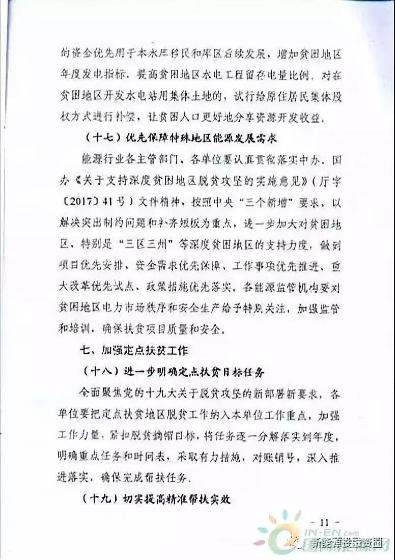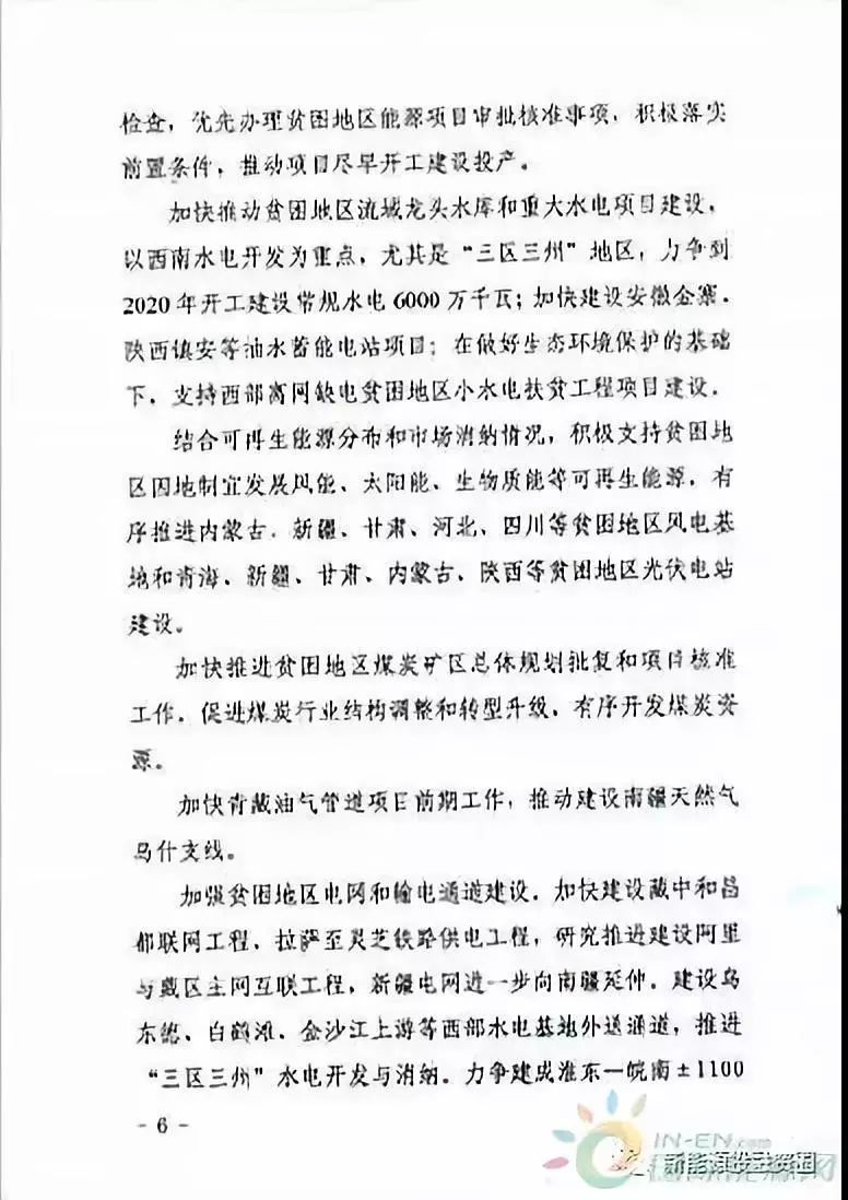 通知指出要加快貧困地區(qū)能源資源開發(fā)建設(shè),優(yōu)先布局能源開發(fā)項目。在符合相關(guān)和政策、條件允許、經(jīng)濟可行的情況下,煤炭、煤電、油氣、水電等資源開發(fā)利用類重大項目,跨區(qū)域重大能源輸送通道項目以及風電、光伏等新能源項目,優(yōu)先在貧困地區(qū)布局建設(shè),加快推進涉及貧困地區(qū)的各類能源規(guī)劃編制、審核、批復工作。以西南水電開發(fā)為重點,有序推進內(nèi)蒙古、新疆、甘肅、河北、四川等貧困地區(qū)風電基地和青海、新疆、甘肅、內(nèi)蒙古、陜西等地區(qū)光伏電站建設(shè);加快青藏油氣管道項目E前期工作;加快推進煤炭礦區(qū)總體規(guī)劃批復和項目核準工作,促進煤炭行業(yè)結(jié)構(gòu)調(diào)整和轉(zhuǎn)型升級;同時加強貧困地區(qū)電網(wǎng)和書店通道建設(shè),加快建設(shè)藏中和昌都聯(lián)網(wǎng)工程、拉薩至靈芝鐵路供電工程等。