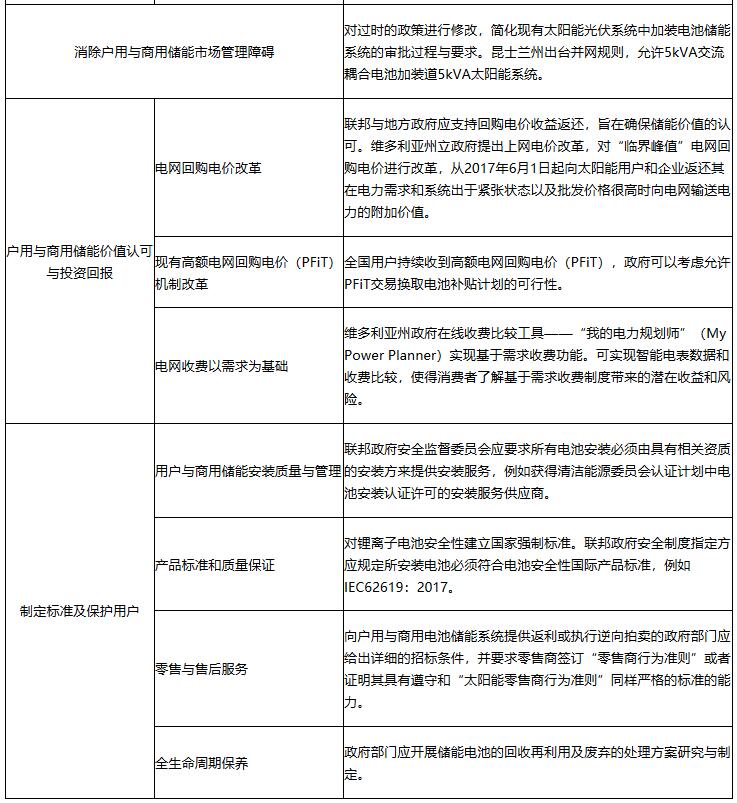 由于澳大利亞的儲(chǔ)能市場(chǎng)以戶(hù)用與商用儲(chǔ)能為主,工業(yè)大規(guī)模儲(chǔ)能相對(duì)發(fā)展落后,因此政府目前政策制定工作著力于在規(guī)范戶(hù)用與商用儲(chǔ)能市場(chǎng)發(fā)展方面,2017年澳大利亞清潔能源協(xié)會(huì)向聯(lián)邦政府提出了13項(xiàng)政策建議,涉及創(chuàng)造公平競(jìng)爭(zhēng)環(huán)境;消除戶(hù)用與商用儲(chǔ)能市場(chǎng)管理障礙;戶(hù)用與商用儲(chǔ)能價(jià)值認(rèn)可與投資回報(bào);建立標(biāo)準(zhǔn)及保護(hù)用戶(hù)四個(gè)方面)。