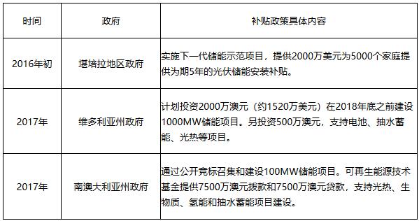 2016年9月南澳大利亞州發(fā)生大范圍停電事故,引起全國(guó)性能源安全的討論。因此抽水蓄能、電池陣列等儲(chǔ)能技術(shù)等電網(wǎng)大規(guī)模儲(chǔ)能技術(shù)成為能源領(lǐng)域的焦點(diǎn)。澳大利亞各州政府相繼推出一系列資金扶持性措施推動(dòng)儲(chǔ)能示范性項(xiàng)目的建立。