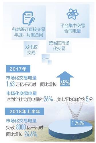 改革在市場化、降成本等方面效果初顯。2017年,各地簽訂直接交易年度、月度合同以及平臺集中交易合同電量,加上跨省區(qū)市場化交易、發(fā)電權(quán)交易等其他交易品種,累計完成市場化交易電量1.63萬億千瓦時,同比增長45%;市場化交易電量達到全社會用電量的26%,度電平均降價約5分。上半年,電力市場化交易繼續(xù)推進,交易品種形式不斷創(chuàng)新豐富,市場化交易電量累計突破8000億千瓦時,同比增長24.6%。