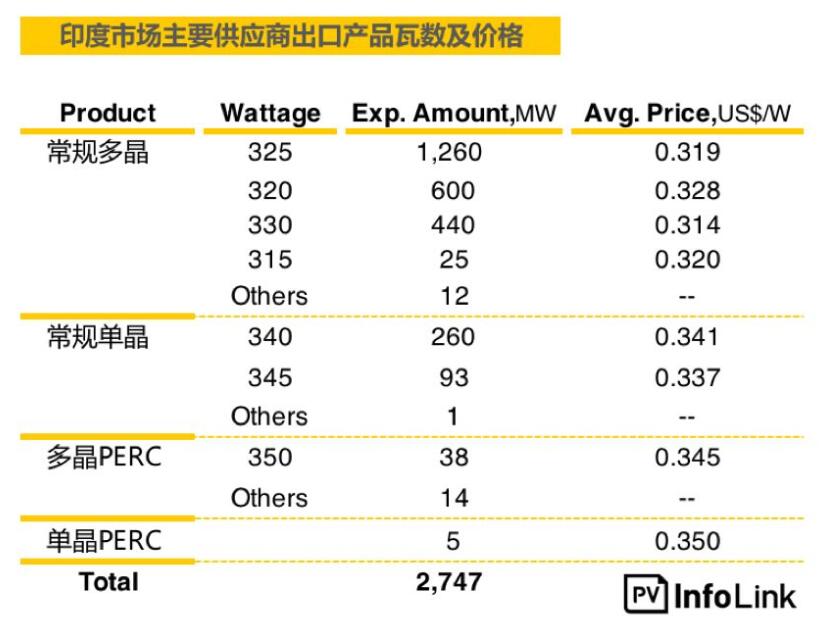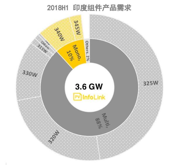 中國供應了印度約九成的光伏需求,而由PV InfoLink中國海關(guān)出口數(shù)據(jù)可看出目前印度市場88%的需求為常規(guī)多晶組件:其中以72片電池片325W、320W、330W及315W為主流,常規(guī)單晶則占印度整體需求之10%;以340W及345W為主,其余單/多晶PERC、N型組件僅占約2%。由此可知,印度市場仍是以消化中國國內(nèi)主流瓦數(shù)之下的產(chǎn)品為主。