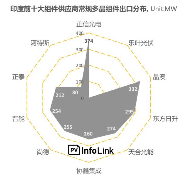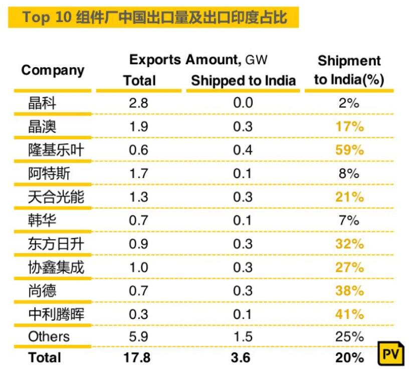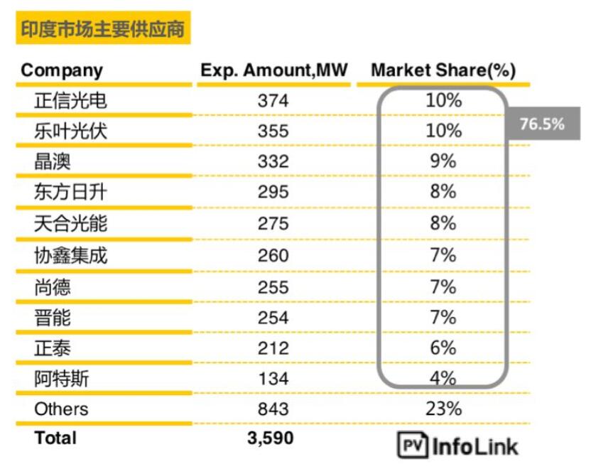 根據(jù)2018上半年中國海關(guān)組件出口統(tǒng)計,印度市場前十大中國組件供應商共占中國出口印度總量76.5%的組件份額。