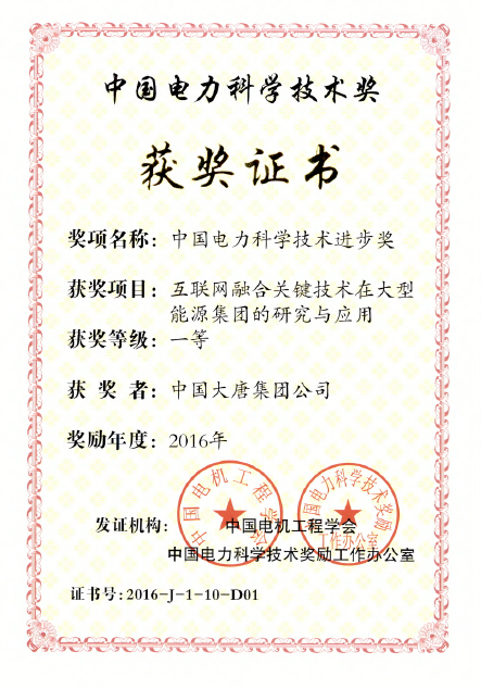 大唐集團(tuán)“互聯(lián)網(wǎng)融合關(guān)鍵技術(shù)在大型能源集團(tuán)的研究與應(yīng)用”項(xiàng)目獲2016年度中國(guó)電力科學(xué)技術(shù)進(jìn)步一等獎(jiǎng)