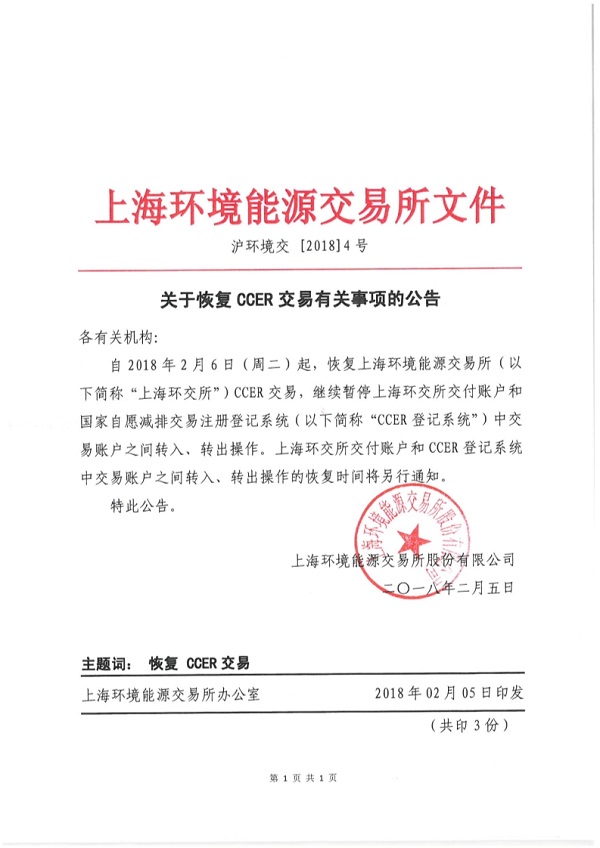 滬環(huán)境交[2018]4號關(guān)于恢復(fù)CCER交易公告