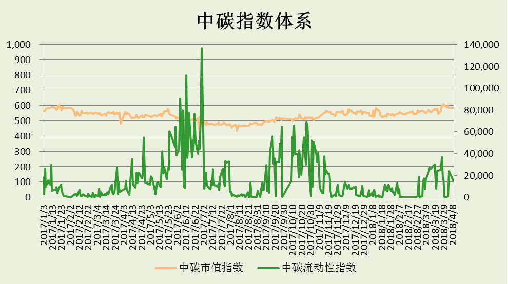 2017交易年度以來,截止到2018年4月10日,中碳市值指數(shù)為582 31點(diǎn),中碳流動(dòng)性指數(shù)8087 48點(diǎn)。2017交易年度迄今的中碳指數(shù)最新走勢如下。數(shù)