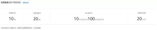其中存儲空間免費10GB、下載流量20GB、10萬次PUT請求和100萬次GET請求。