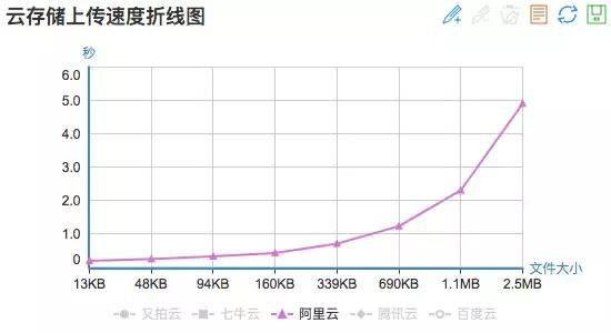 阿里云的上傳速度非常不錯。在 500KB 以內(nèi)的文件,基本都可以實現(xiàn)一秒內(nèi)上傳完成;1MB 的文件上傳速度只有 2.3s 。