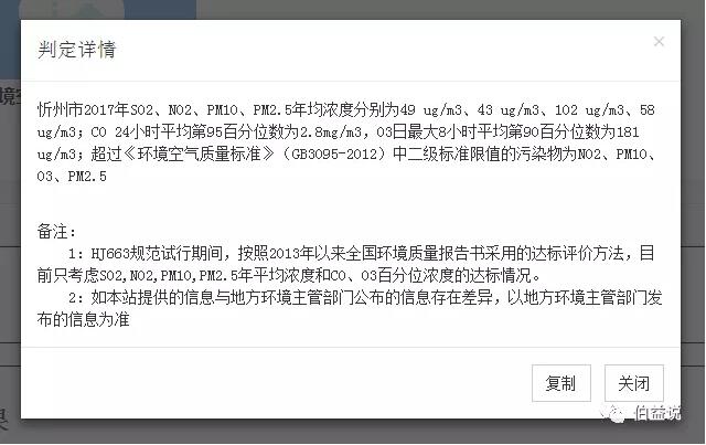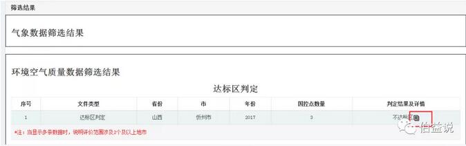 6、篩選結(jié)果顯示在數(shù)據(jù)篩選結(jié)果表中,判定結(jié)果已經(jīng)顯示項目區(qū)域是否達標(biāo),點擊不達標(biāo)區(qū)右側(cè)的方塊符號,即可看到具體判定詳情,即當(dāng)?shù)啬甓葷舛葦?shù)據(jù),可用于環(huán)評報告中環(huán)境質(zhì)量現(xiàn)狀判定。